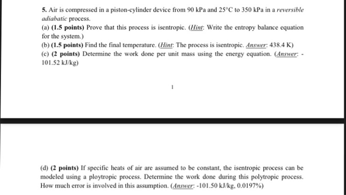 Solved 5 Air Is Compressed In A Piston Cylinder Device F Chegg Com